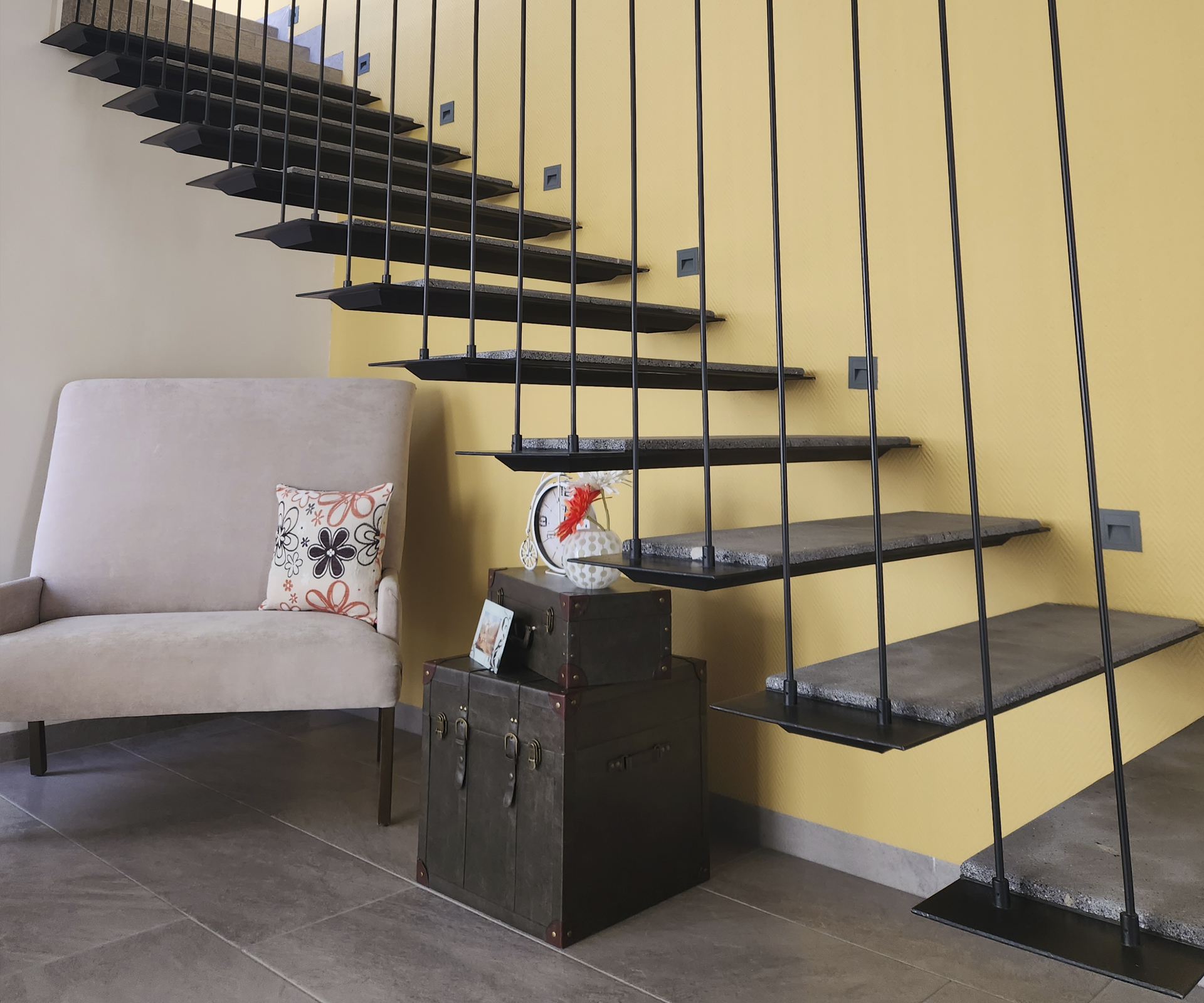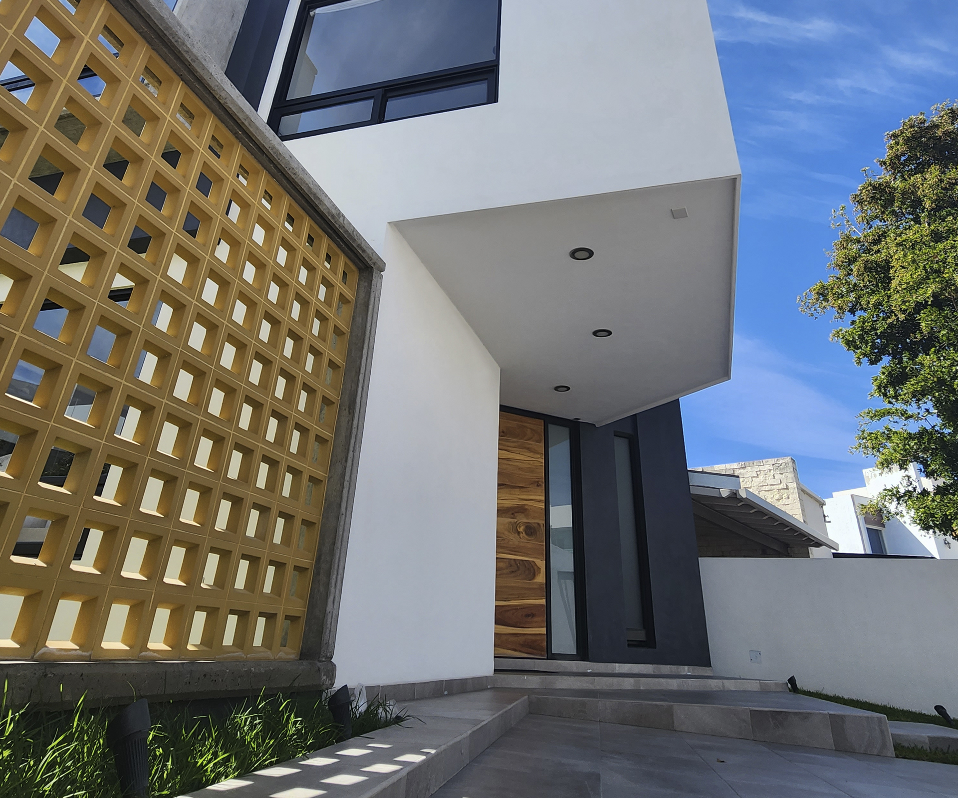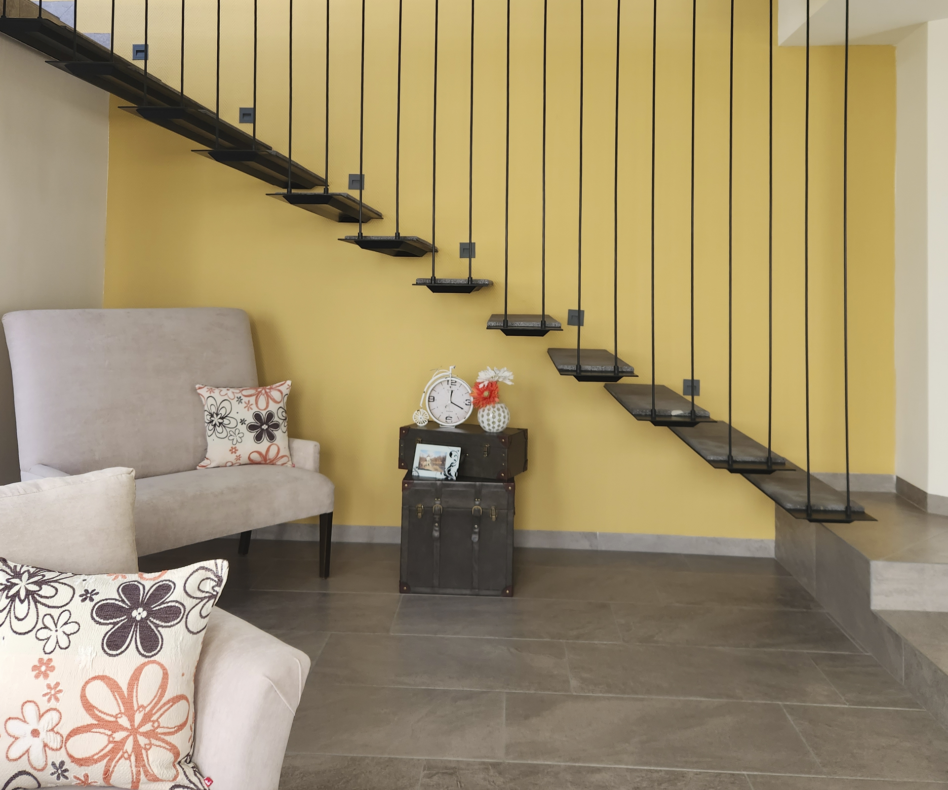 El diseño genero la creación de un jardín a todo lo largo del terreno y una terraza central que nos permitió un dialogo del interior con el exterior, sin ser visto por el peatón. Lo que genera esta incertidumbre de saber que pasa al interior de la casa. Esto nos permitió generar un punto focal al ingresar a la casa teniendo unas escaleras suspendidas que dan la sensación de una ligereza y esbeltes que resaltamos con una textura y fondo color amarillo, que en conjunto con todo el proyecto ya nos habla de una armonía en conjunto.